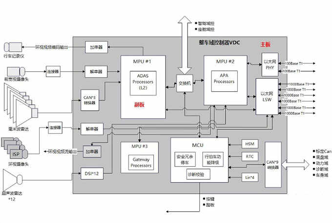 高配版本的VDC需要考虑一部分功能为智驾功能预留。因此整车域控的设计过程将比传统的简单ECU复杂许多。典型的硬件端口设计思路参照如下图所示。