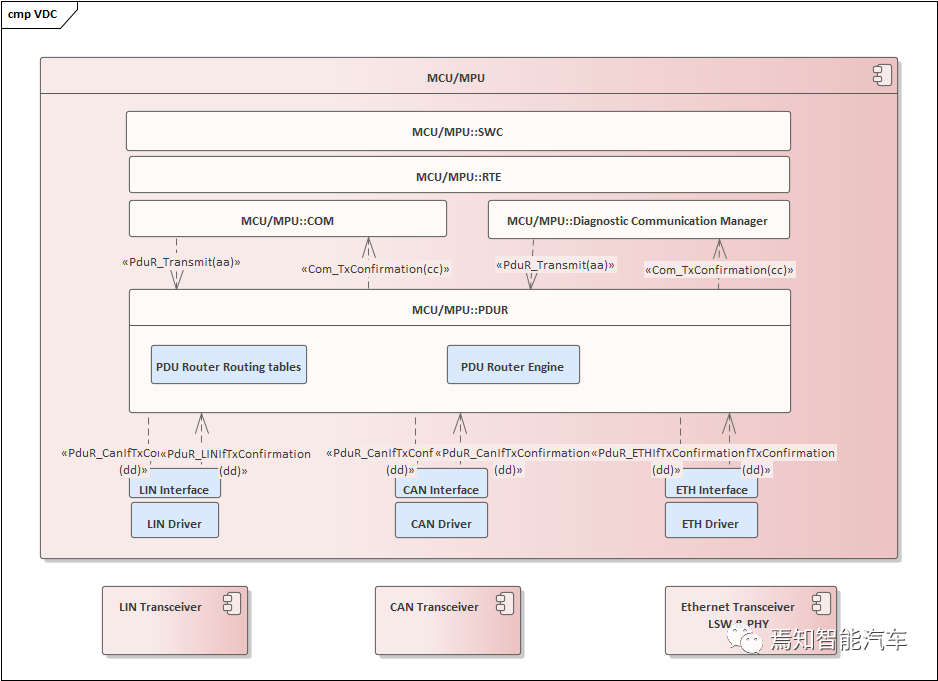 整个VDC的PDUR Router模块功能包含单播、多播、网关1对多、多对一、多对多等多种方式的路由模块功能。期间,PDUR Router 需要执行PDU接收到本地模块(I-PDU从下接收发送至上层)、PDU从本地模块传输(I-PDU从上接收发送至下层)、PDU网关(从接口模块和传输协议模块接收I-PDU并传输至其他通信接口模块)这三种功能。从而确保路由功能的有效性。