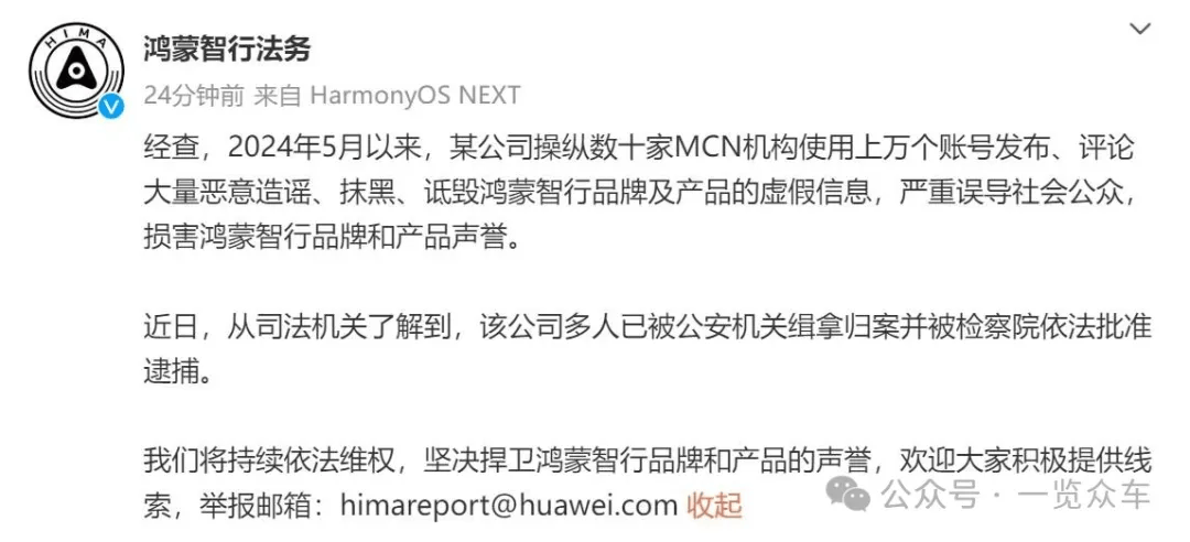 鸿蒙智行法务部曾披露,自2024年5月起,某公司通过操控数十家MCN机构及数万个账号,在社交平台发布大量虚假信息抹黑品牌,相关行为被司法机关认定为有组织的网络黑公关活动,目前多名涉案人员已被公安机关缉拿归案并被检察院依法批捕。